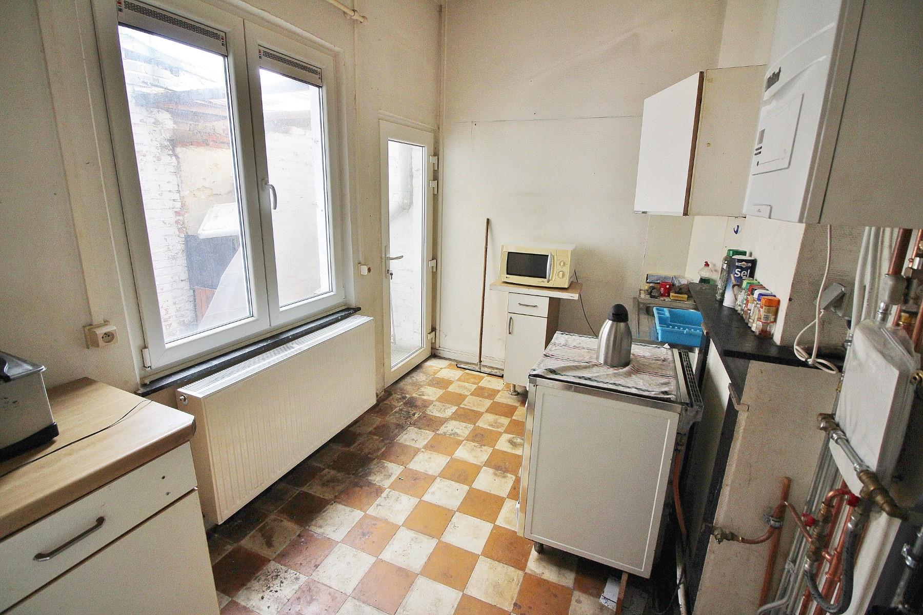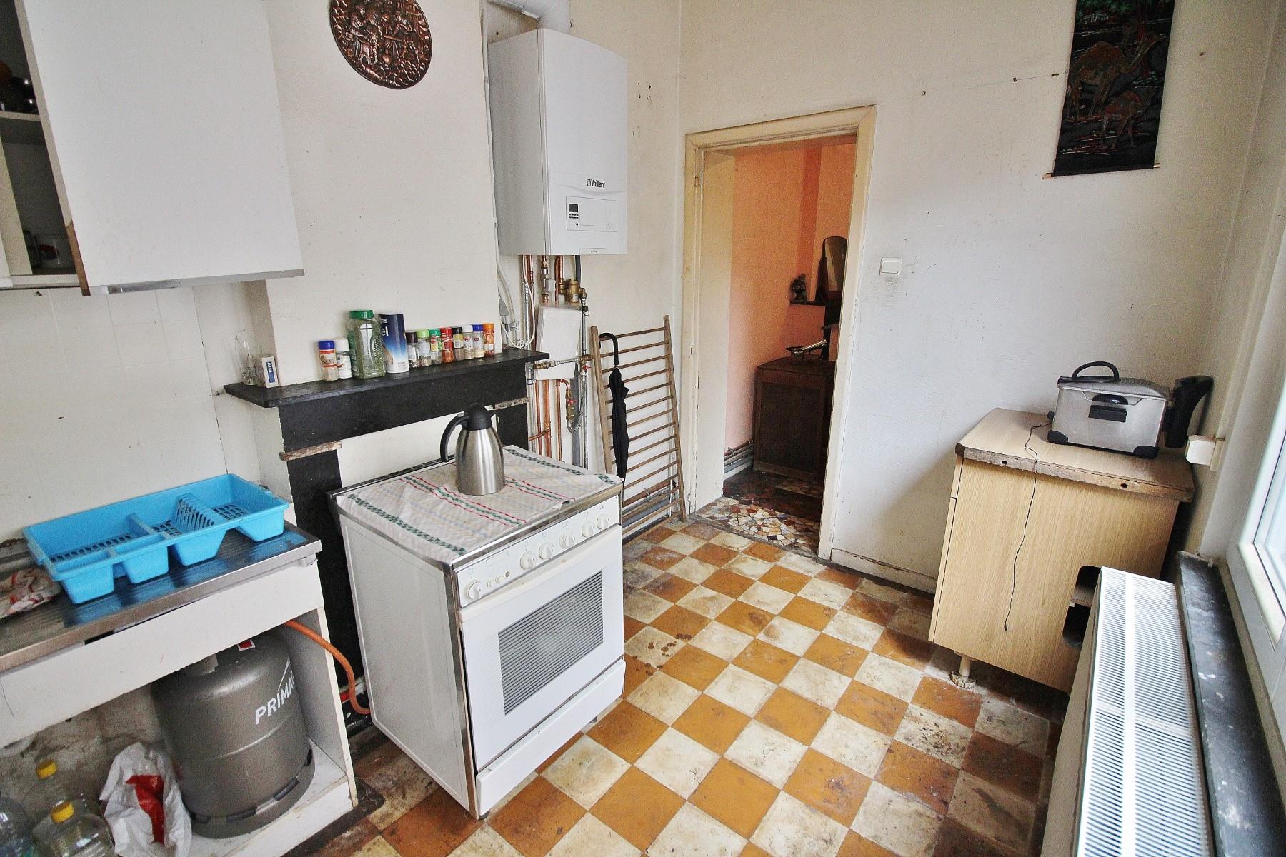 ***SOUS COMPROMIS DE VENTE*** Maison d'habitation unifamiliale à remettre aux gouts du jour, située proche de l'ensemble des commodités (bus, école, commerce, commerces). Composée au rez-de-chaussée d'un salon, une salle à manger, une cuisine meublée donnant accès à une petite cour (8m²). Au 1er étage: 2 chambres (14 et 16m²) dont une donnant accès à une salle de bain (baignoire, WC, évier). -1 : cave saine. Structure béton, châssis en double vitrage PVC, chauffage central au gaz (chaudière à condensation VAILLANT +-1ans), électricité à remettre en conformité, toit : plateforme en roofling. Possibilité de bénéficier des frais d'enregistrement réduits à 6% (RC:391€). Immeuble sain idéal comme premier achat ou investissement (actuellement loué 450€ hors charges). Plus d'infos/visite sur place ? 04/366.00.26