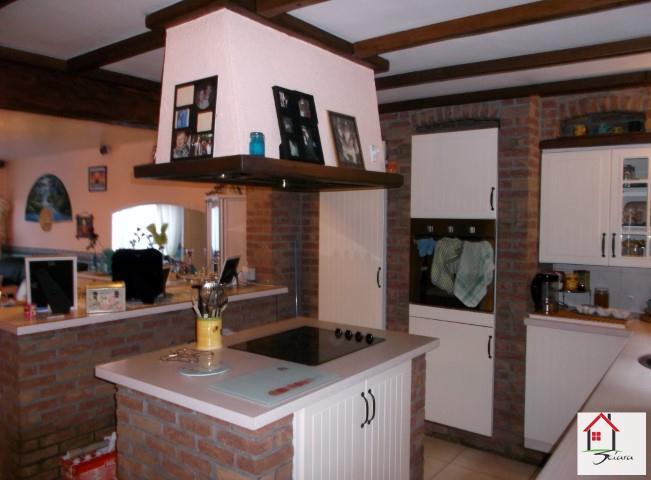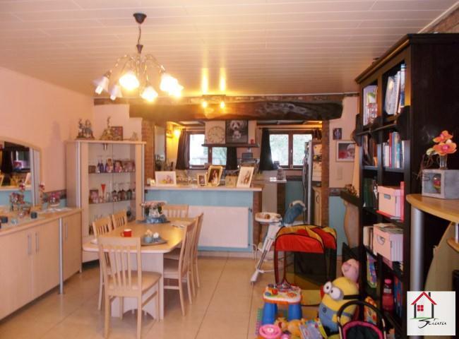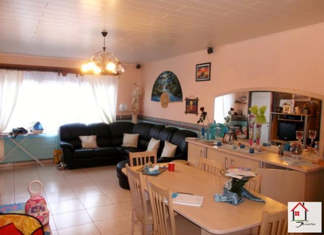 OPTION!! Bonne maison d'habitation 3 façades style bel-étage située proche de toutes les commodités et axes autoroutiers. Composée au rez-de-chaussée d'un grand hall d'entrée, avec un bureau (ou chambre), 2 grands espaces sur l'arrière (atelier - buanderie) et un garage (1 voiture + rangement). Au 1er étage: hall, un grand living ouvert sur une cuisine équipée (ilot central, taque, four, hotte, lave-vaisselle) avec accès terrasse et jardin sur l'arrière, 2 chambres (17m² - 9m²) en enfilade et une salle de bain (carrelée, douche, wc, évier). Au 2ème étage: hall de nuit avec 1 chambre et un espace rangement (dressing ou grenier). Chauffage central au gaz (4ans - chaudière à condensation), châssis en double vitrage. La parcelle latérale est comprise dans la vente (parking et/ou construction envisageable). Possibilité de bénéficier des frais d'enregistrement réduits (RC: 550€). Idéale pour une grande famille, beaux volumes. Rem: les panneaux photovoltaïques ne font pas partie de la vente. A VOIR!!